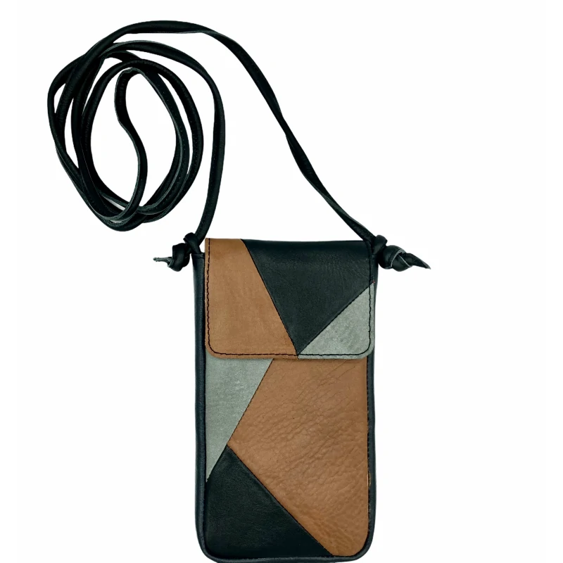 This leather iPhone/ Samsung Galaxy bag Nigela patchwork colour is an ideal bag to tag along your phone. On the back side of this case there is a zippered compartment for your cards or some cash. You can wear the Nigela cross body, but you could also take the strap off. This bag Nigela is practical and gorgeous to wear when you go to festivals, beach or have a hectic job. Without the strap it is a perfect little case to carry along in your bag. It has a pushbutton to close the flap. One can also use it as a small bag for other items of course. The padding offers good protection. One of our best sold designs. The patchwork design makes this bag a unique one. We designed a collection made out of offcuts from former gm z productions.