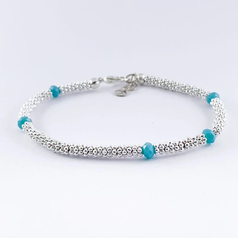 The bracelet Ambrosia is a silver bracelet with green or blue stones. The closure is adjustable and suitable for a 185 mm wrist.