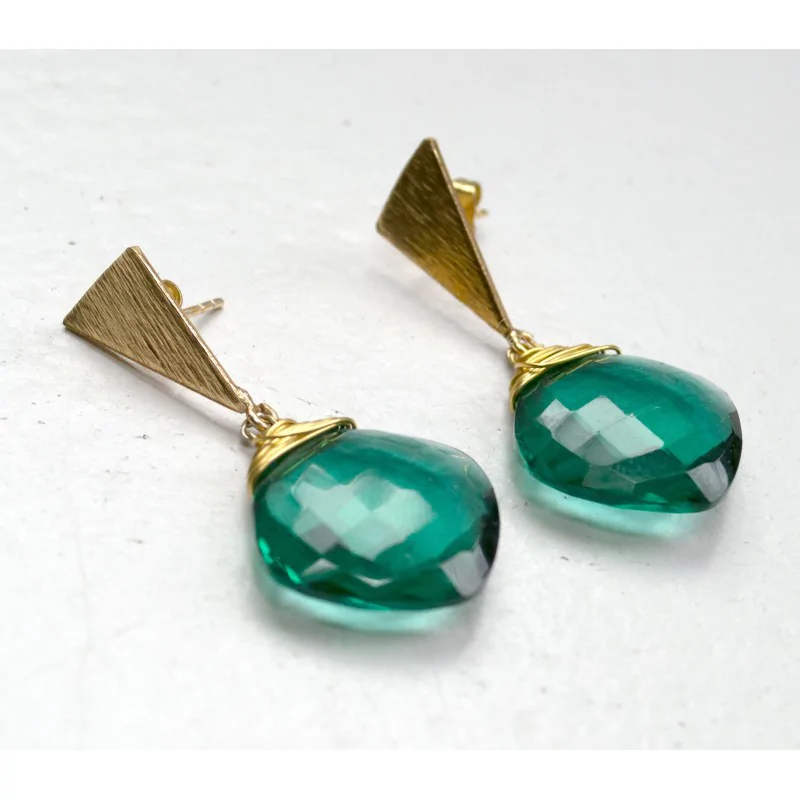 The brass earrings Blair wit this teal colored quartz are a real statement pair of earrings. The quartz catches the light beautifully. The brass setting makes it more than special.