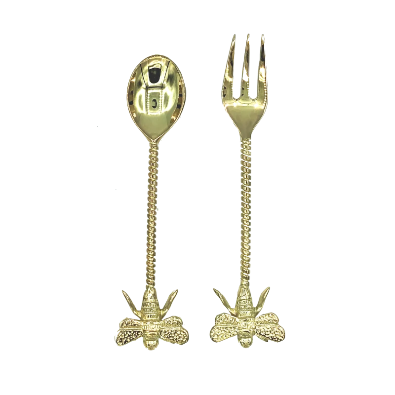 This brass fork and spoon have a cute little bee at the handle. Luxurious solid quality cutlery made of brass. This set has a golden look due to his polish finishing, great for everyday use or simply for decoration. Utensils like brass and copper are noted to hold therapeutic benefits, whether you use them for cooking, or to eat your meals.