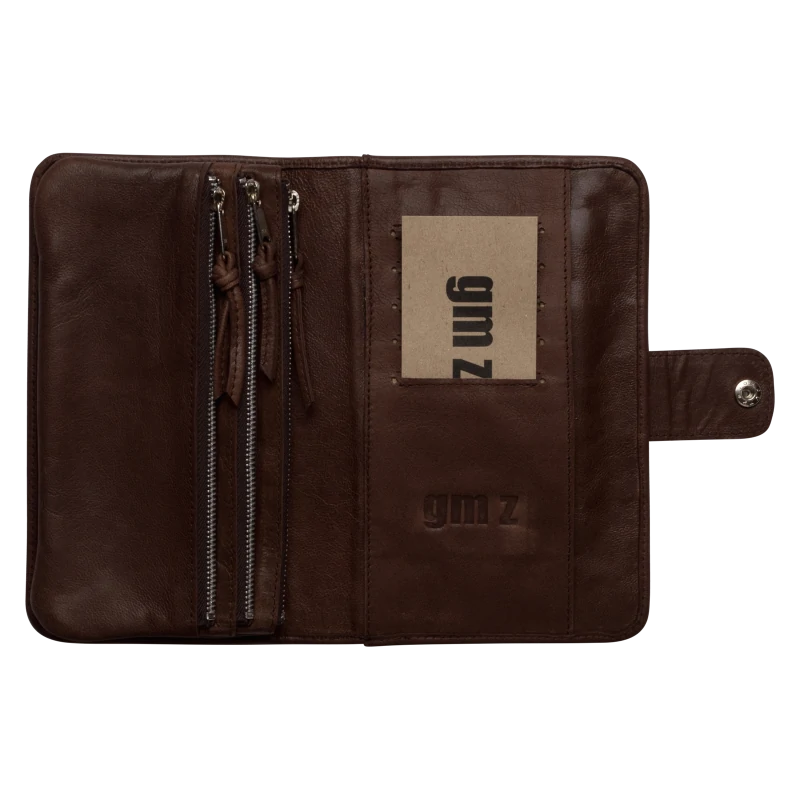 The GMZ phone wallet Zaza is for organised people that like big wallets. People that like to have an overview of their cards, change, mobile phone and receipts. Yes, even your mobile phone Aplle up to 12 or Samsung Galaxy fits comfortably inside. The interior has 5 cardslots, three zippered compartments and three open compartments. And beautiful enough to tag along as a small clutch. This wallet is closed by a push button.