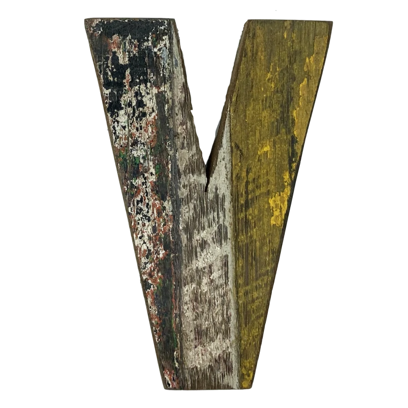 De houten letter V is gemaakt van een oude vissersboot. De rustieke 'look' is speels en prachtig op een muur. Je kunt spelen met woorden en kleuren; een mooi woord in je keuken, de naam van je nieuwe baby, het initiaal van je kind op zijn deur en nog andere creatieve mogelijkheden.