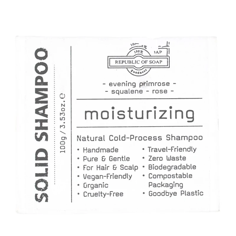 Deze solide shampoo is voor droog haar. Deze handgemaakte shampoo is organisch, eco-vriendelijk en 'cruelty-free' geproduceerd. Daarnaast is de verpakking biologisch afbreekbaar en zorgt dus voor 'zero waste'.